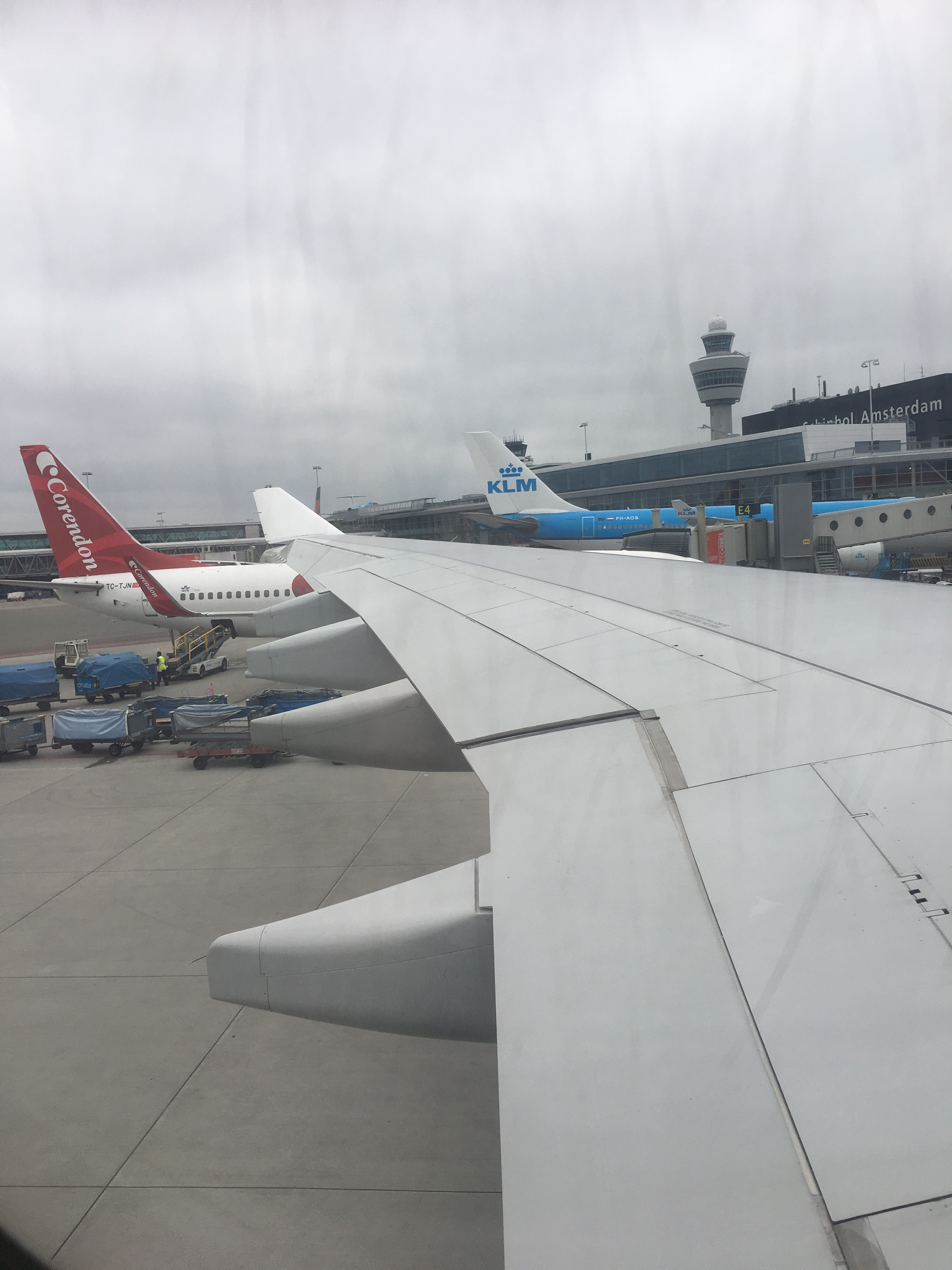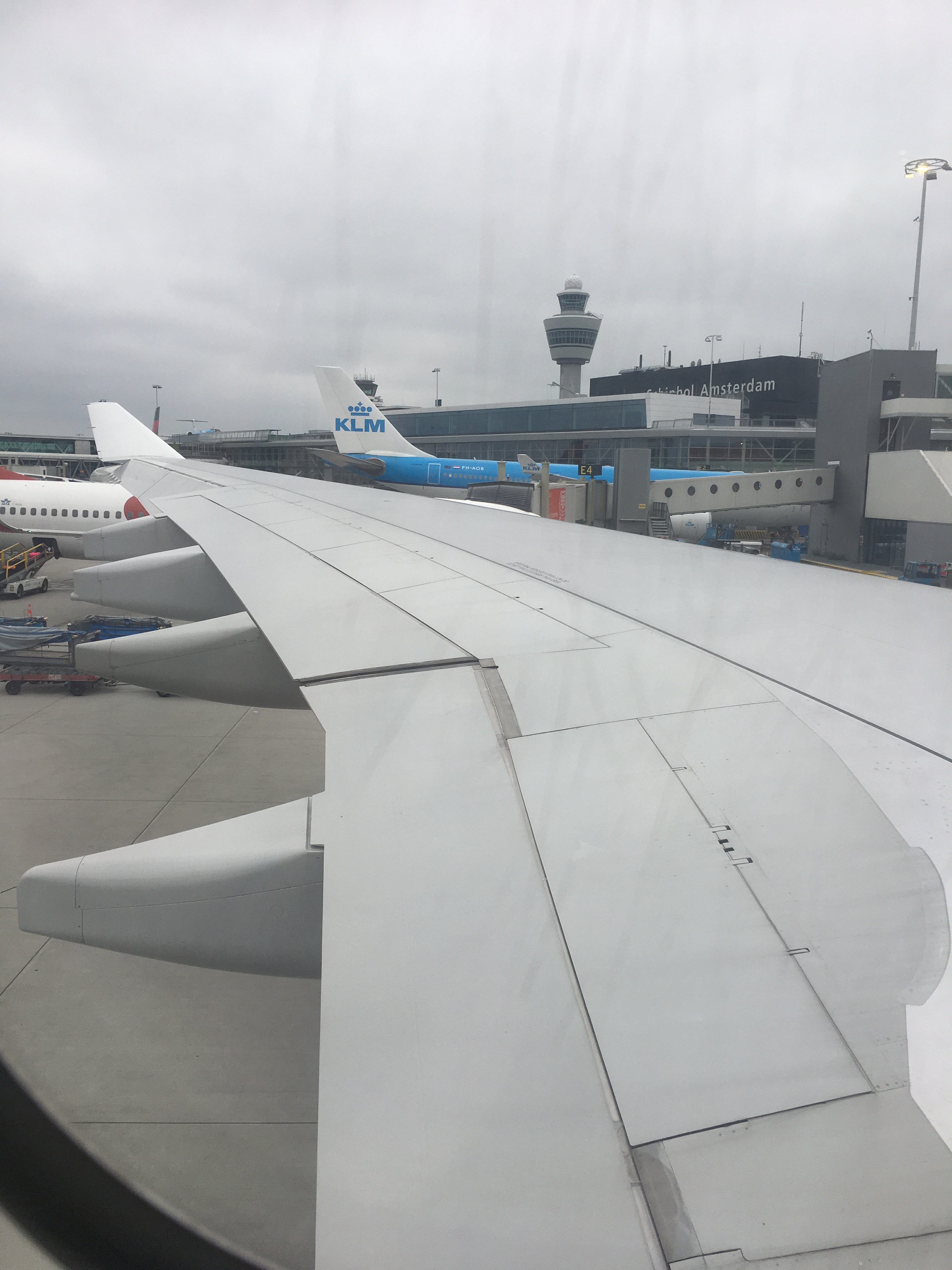 Vanochtend ging om kwart over 7 de wekker. De laatste spullen in de handbagage, ontbijten en om 8 uur zaten we in de auto richting Schiphol. De koffers pasten precies, of de terugweg ook gaat lukken wordt spannend… Het was onderweg rustig, en rond twintig voor 10 kwamen we aan bij de parkeergarage en hebben we de auto geparkeerd. Koffers uit de kofferbak gehaald en richting de shuttlebus gegaan die ons naar vertrekhal 3 bracht.
