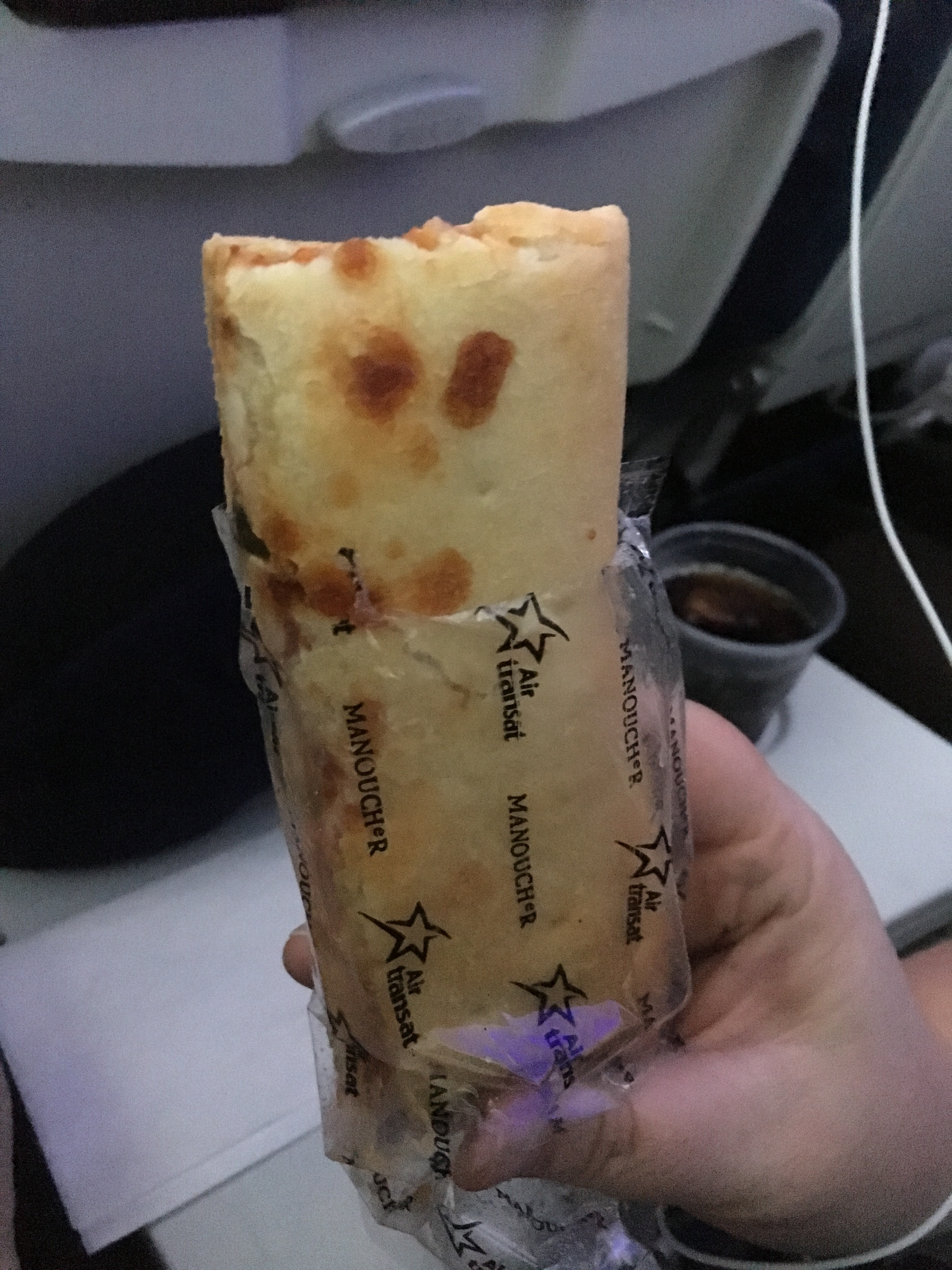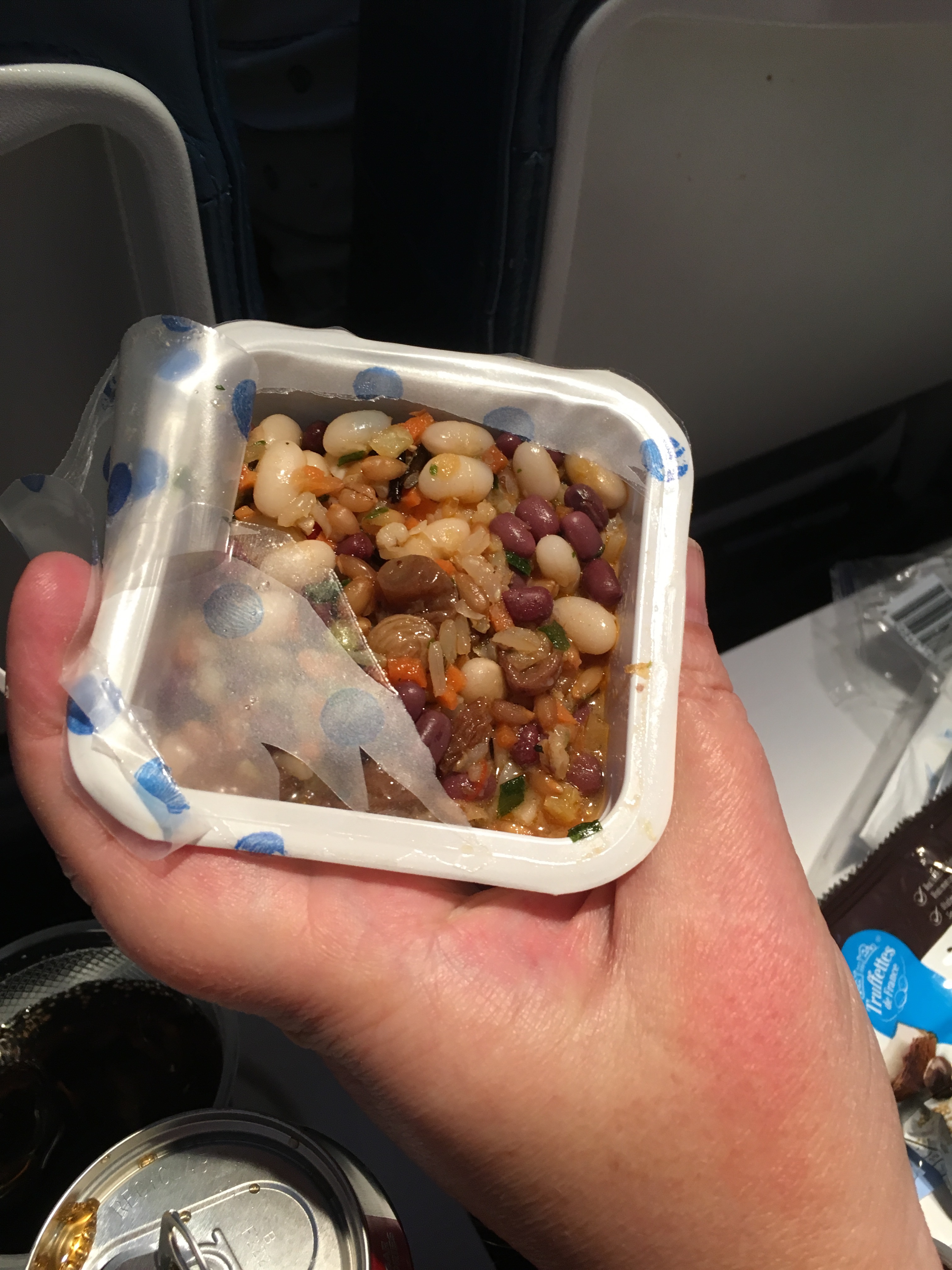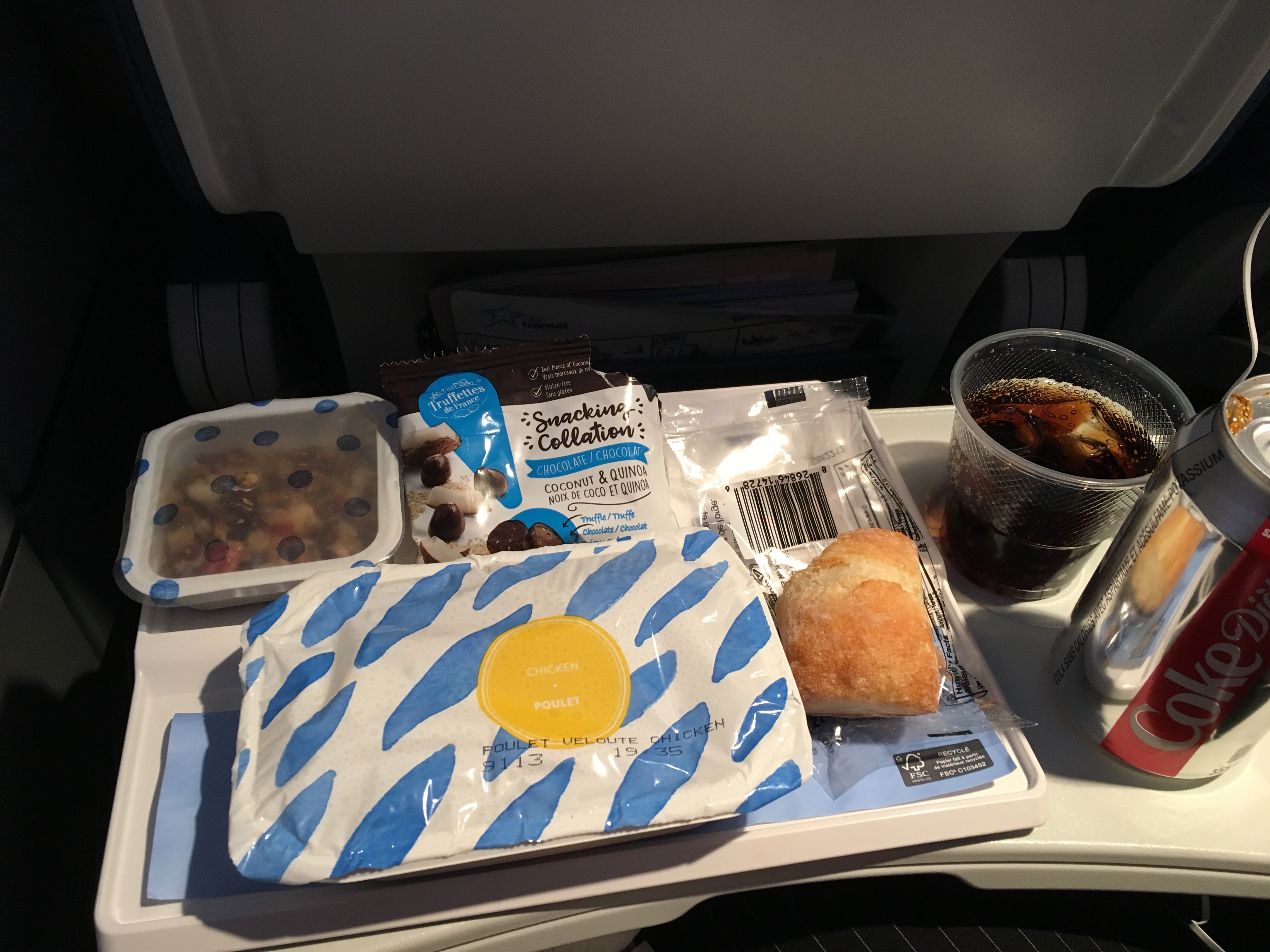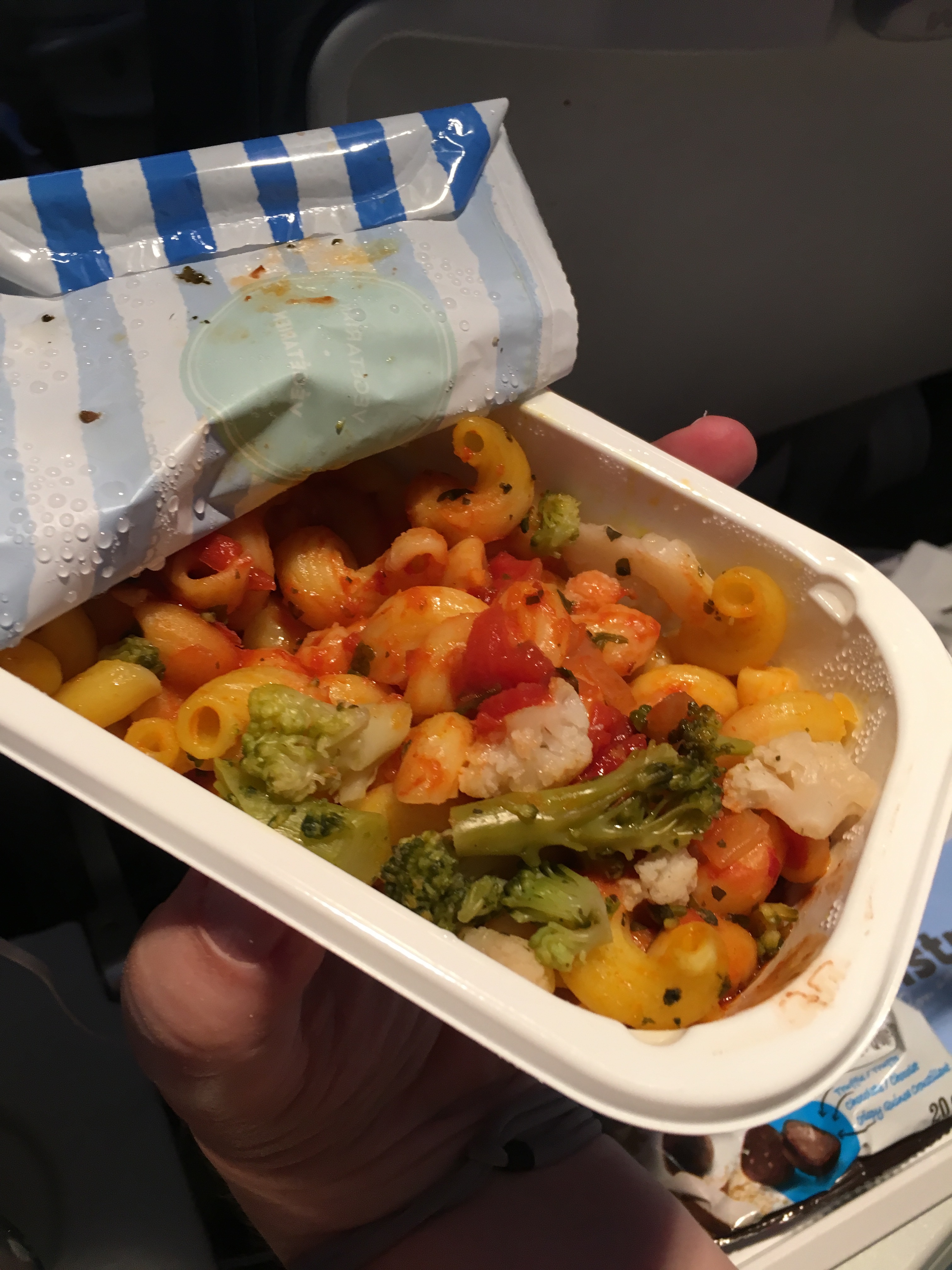 Na ongeveer twee uur was het tijd voor warm eten. De gebruikelijke keuzes, pasta en kip. Laat ik het zo zeggen, het meeste is weer retour gegaan. Alleen al de geur die van het eten kwam was niet echt bevorderlijk voor de eetlust.. Gelukkig hadden we zelf ook broodjes meegenomen. We hebben geleerd van vorige vluchten.. 😉