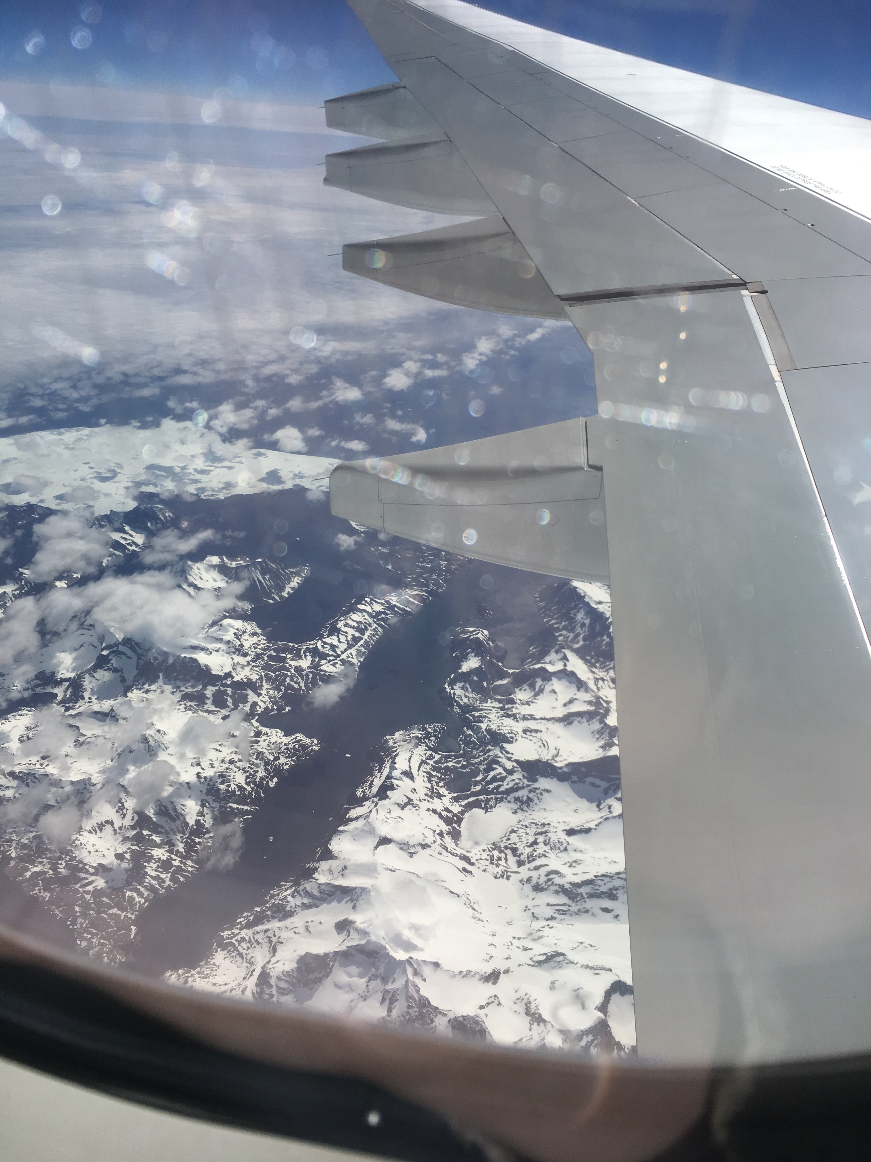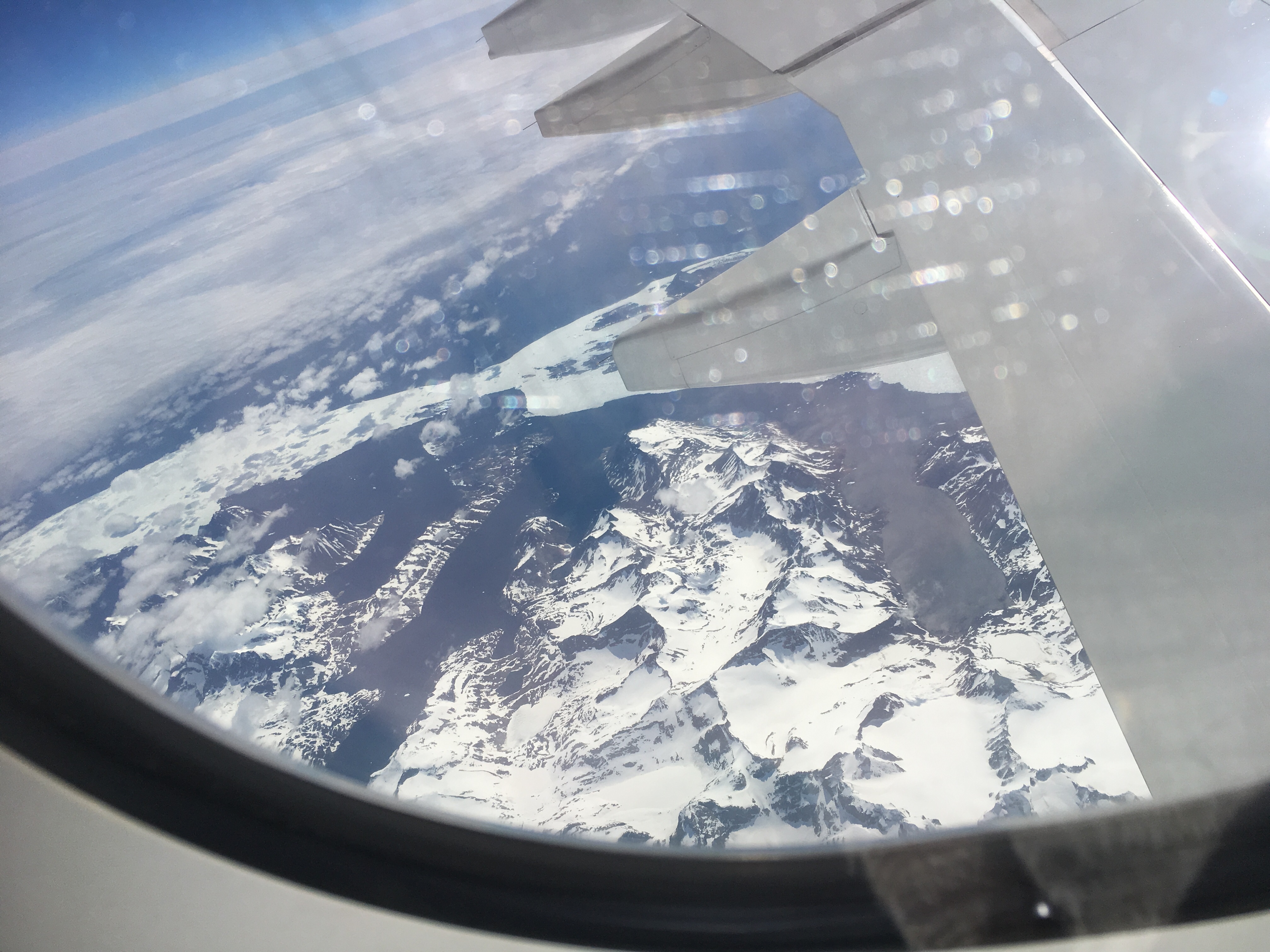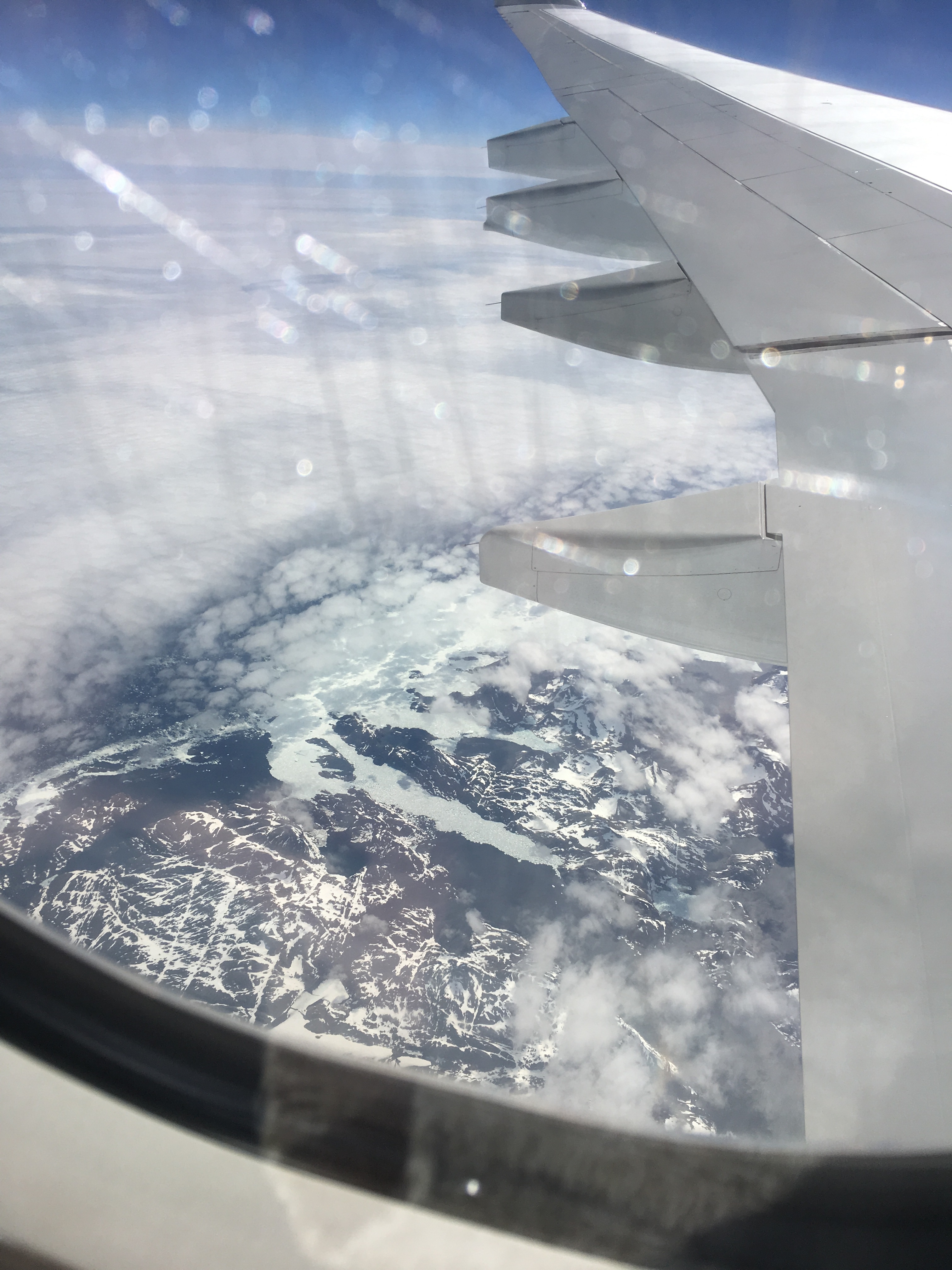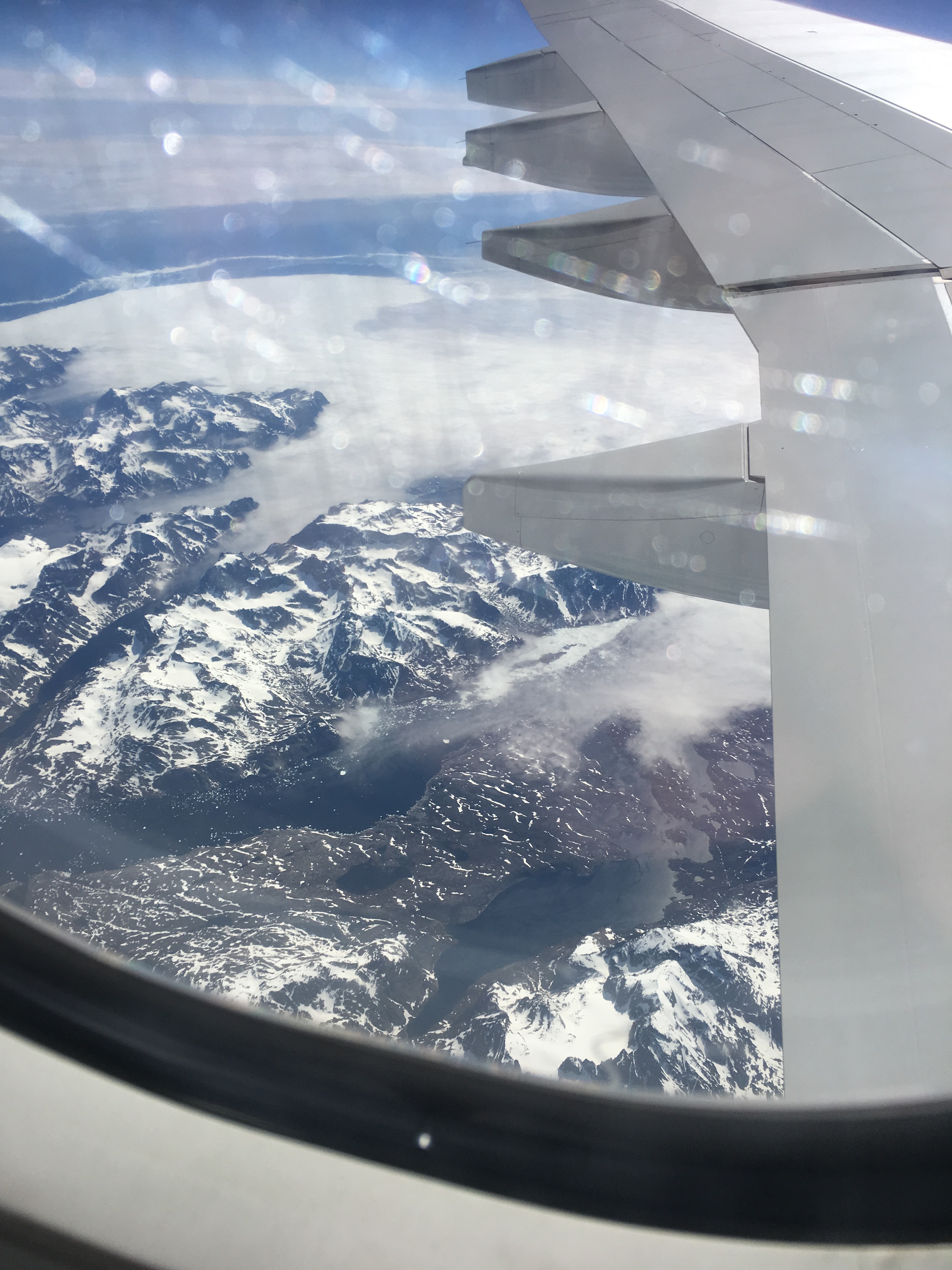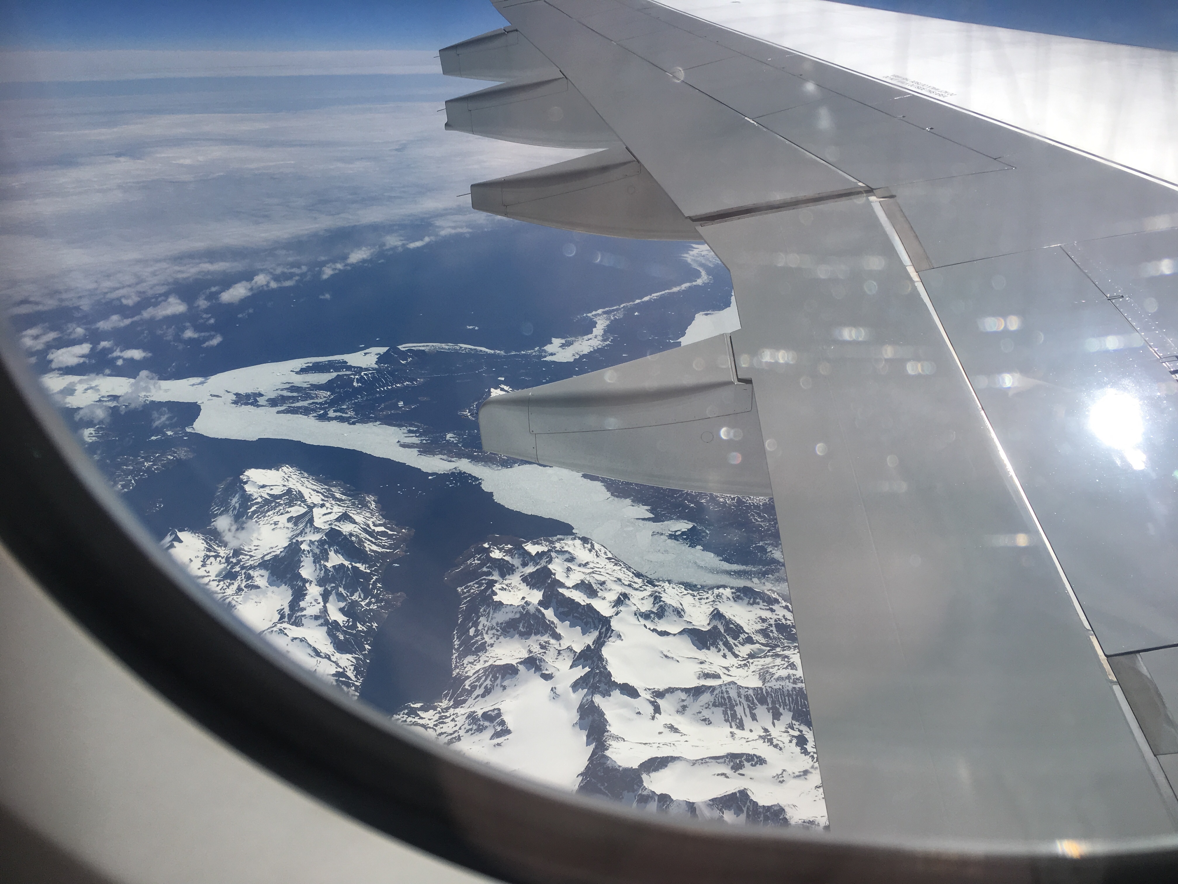 Toen we boven Groenland vlogen riep de piloot om dat er vrijwel geen wolken boven Groenland zaten en er dus zicht was op de ijsrotsen. Heel bijzonder om te zien!