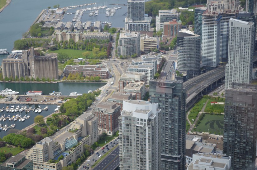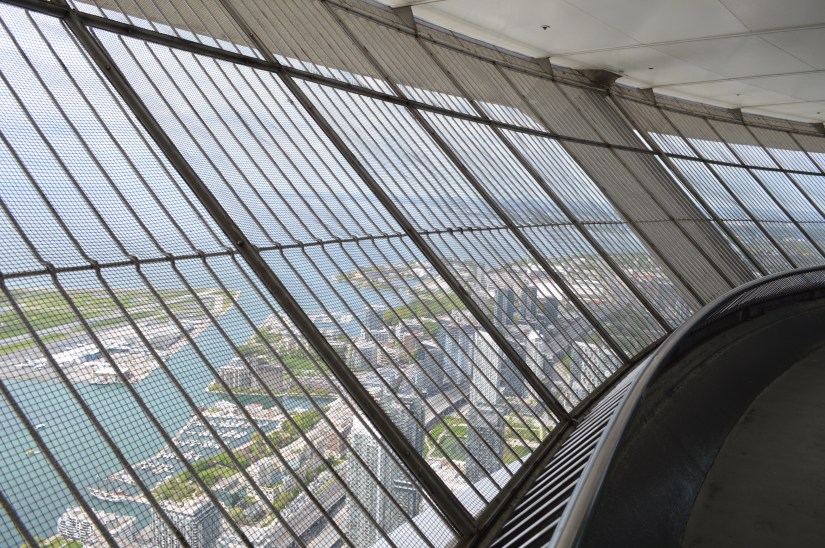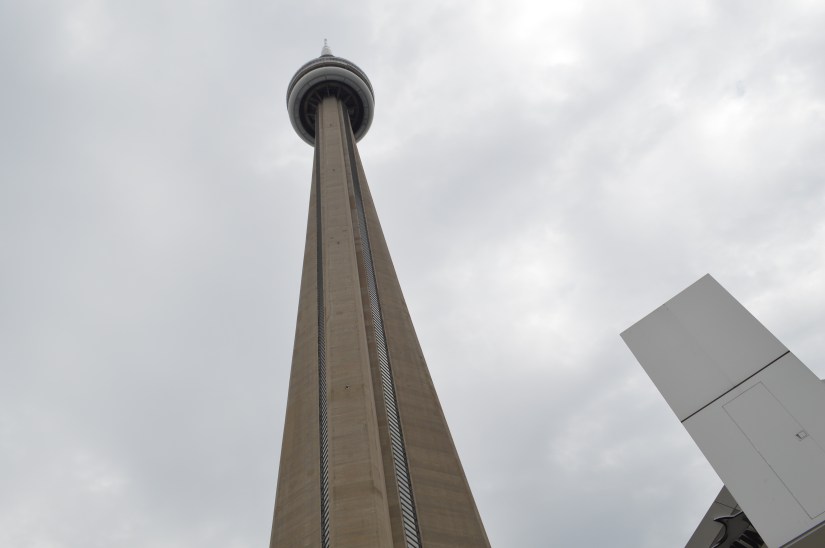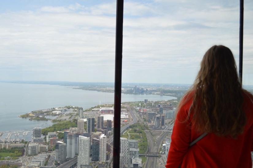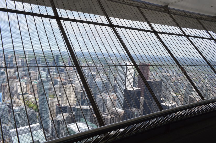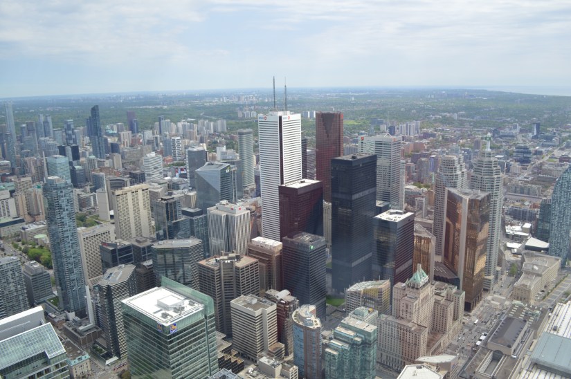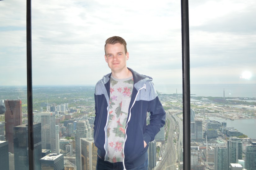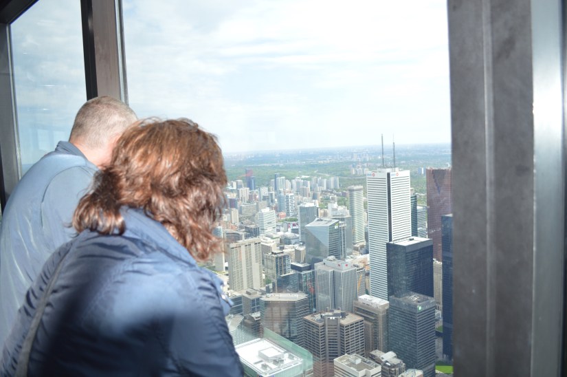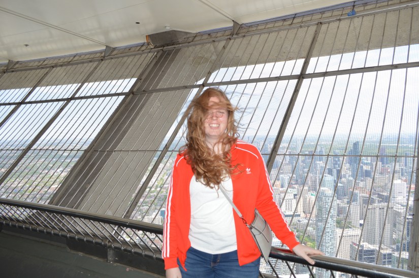 Vanochtend hebben we eerst op de hotelkamer ontbeten. Daarna zijn we met een Uber naar de binnenstad van Toronto gegaan. Dit was onze eerste Uber ervaring, dit beviel goed. We werden mooi voor de CN Tower afgezet, onze eerste bestemming van de dag. De CN Tower heeft een uitkijkpunt over de stad op 342 meter hoogte. Hierdoor heb je een heel mooi uitzicht op de stad, mits het weer meezit. En gelukkig voor ons was het ook vandaag weer mooi weer! We konden heel ver kijken, wat een gigantische stad is Toronto! Je wordt als eerste bij het bovenste uitkijkpunt afgeleverd waar je achter glas naar de stad kunt kijken. Daarna zijn we nog een etage lager gegaan waar je buiten kon kijken. Hier waaide het maar een klein beetje, zie foto.. 😉