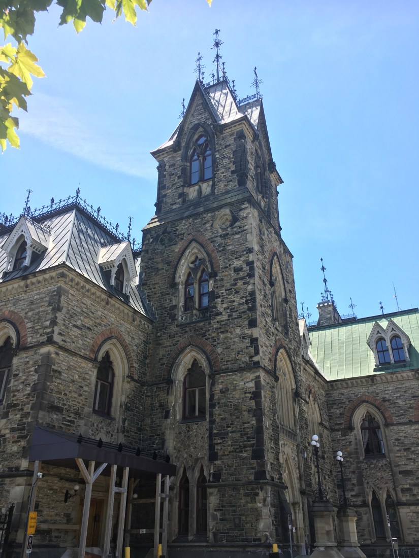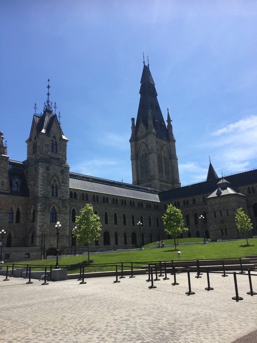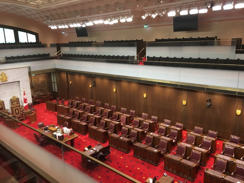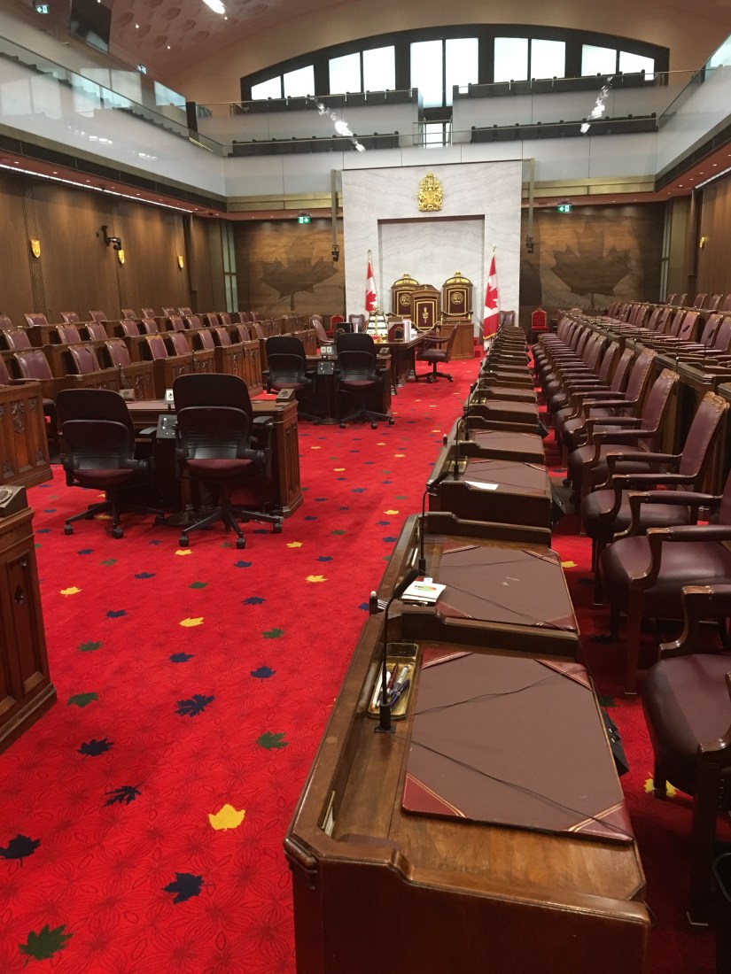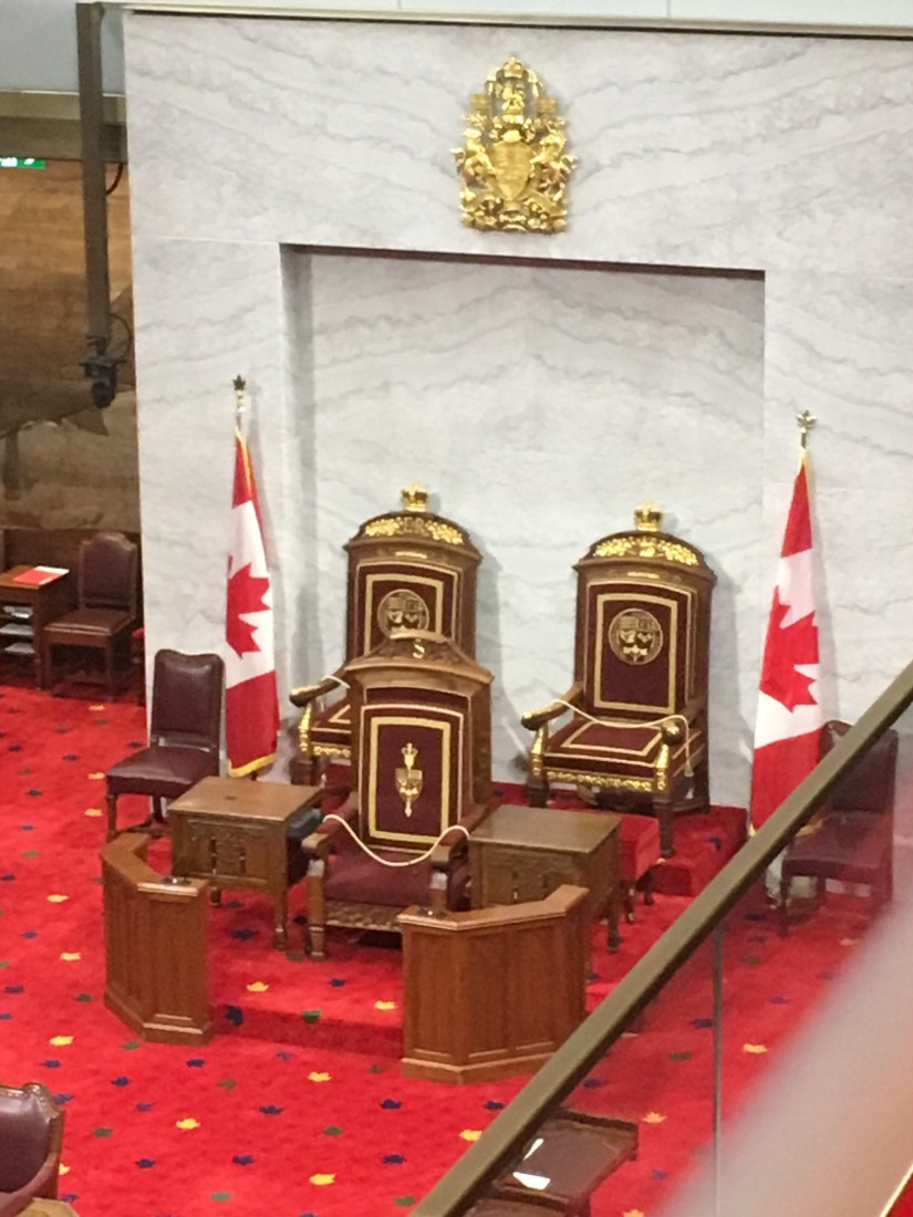 Rond half elf zijn we richting the House of Senate gelopen. Hier hadden we een tour gepland staan om 11:30 en moesten twintig minuten van te voren aanwezig zijn omdat je eerst nog langs security moest. Bij dit soort scans gaat het poortje altijd af op de knie van mijn vader, gelukkig zit er een mooi litteken dus hebben ze het gelijk door. Desalniettemin wordt hij dan toch nog een keer extra gescand. The House of Senate is sinds begin dit jaar verhuisd naar het pand waar het nu zit omdat de originele plek compleet gerenoveerd wordt, een tienjarenplan zoals het nu staat. The House of Senate zit nu in een oud treinstation, ook een mooi gebouw met mooie oude details. Van de tourguide kregen we veel informatie over hoe het systeem in Canada werkt. Het systeem is vergelijkbaar met het systeem in Nederland.
