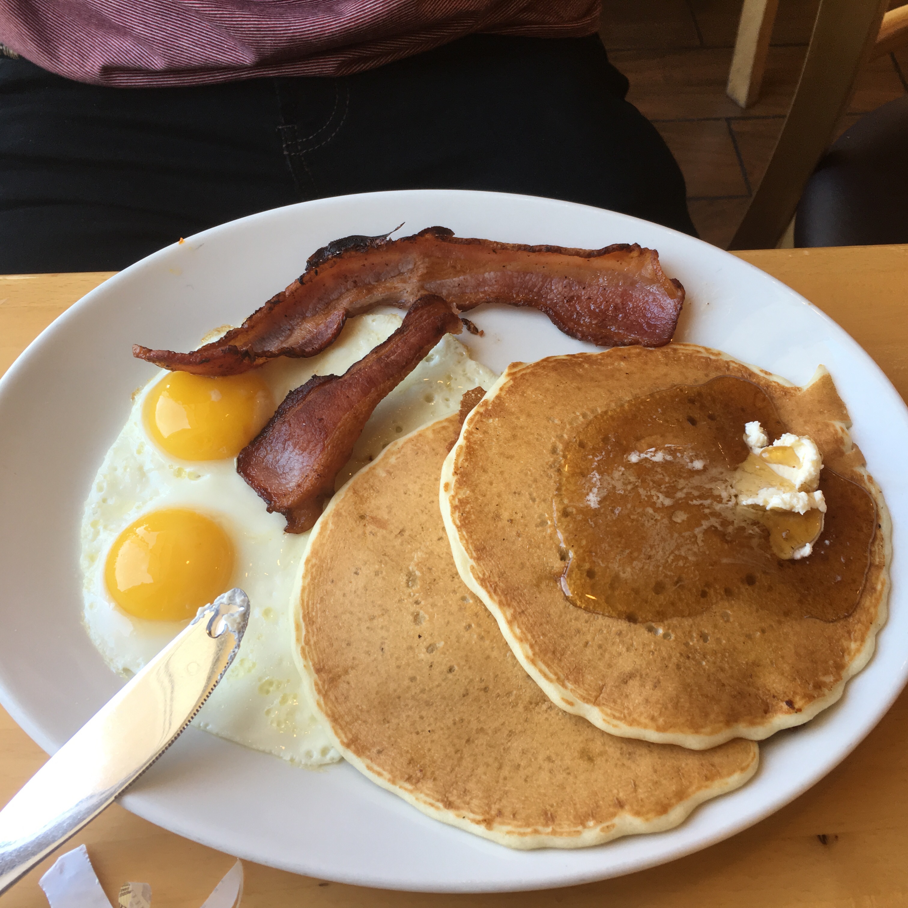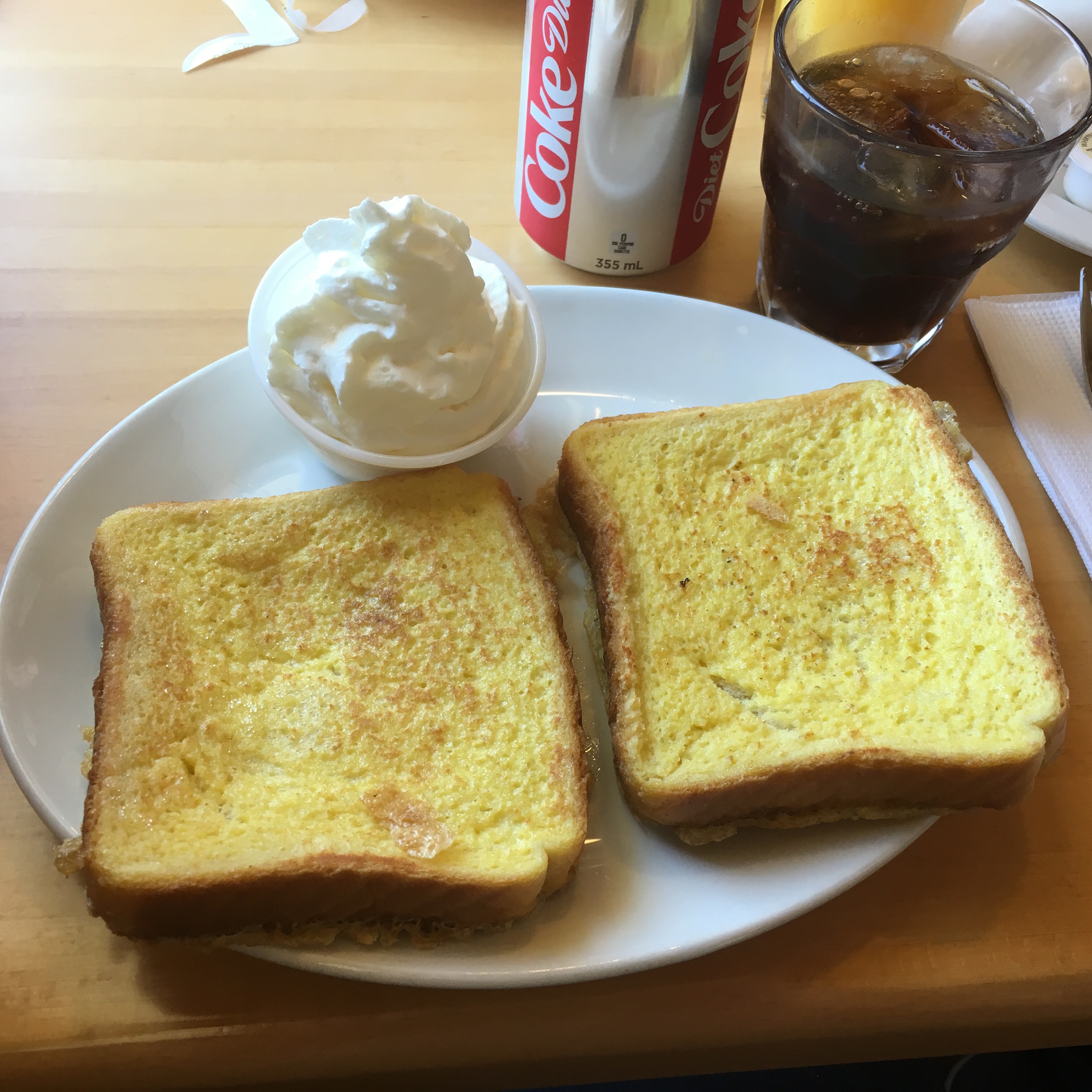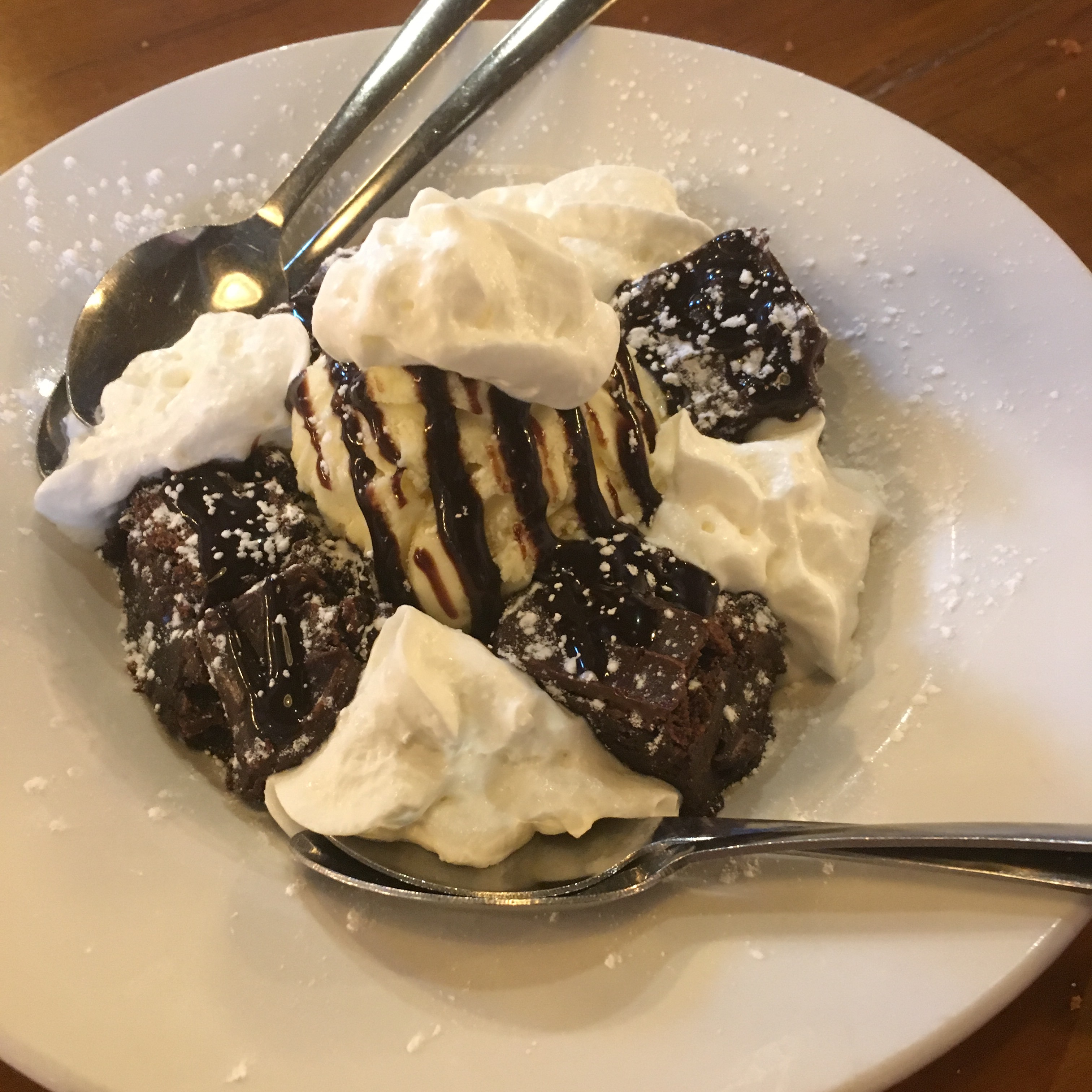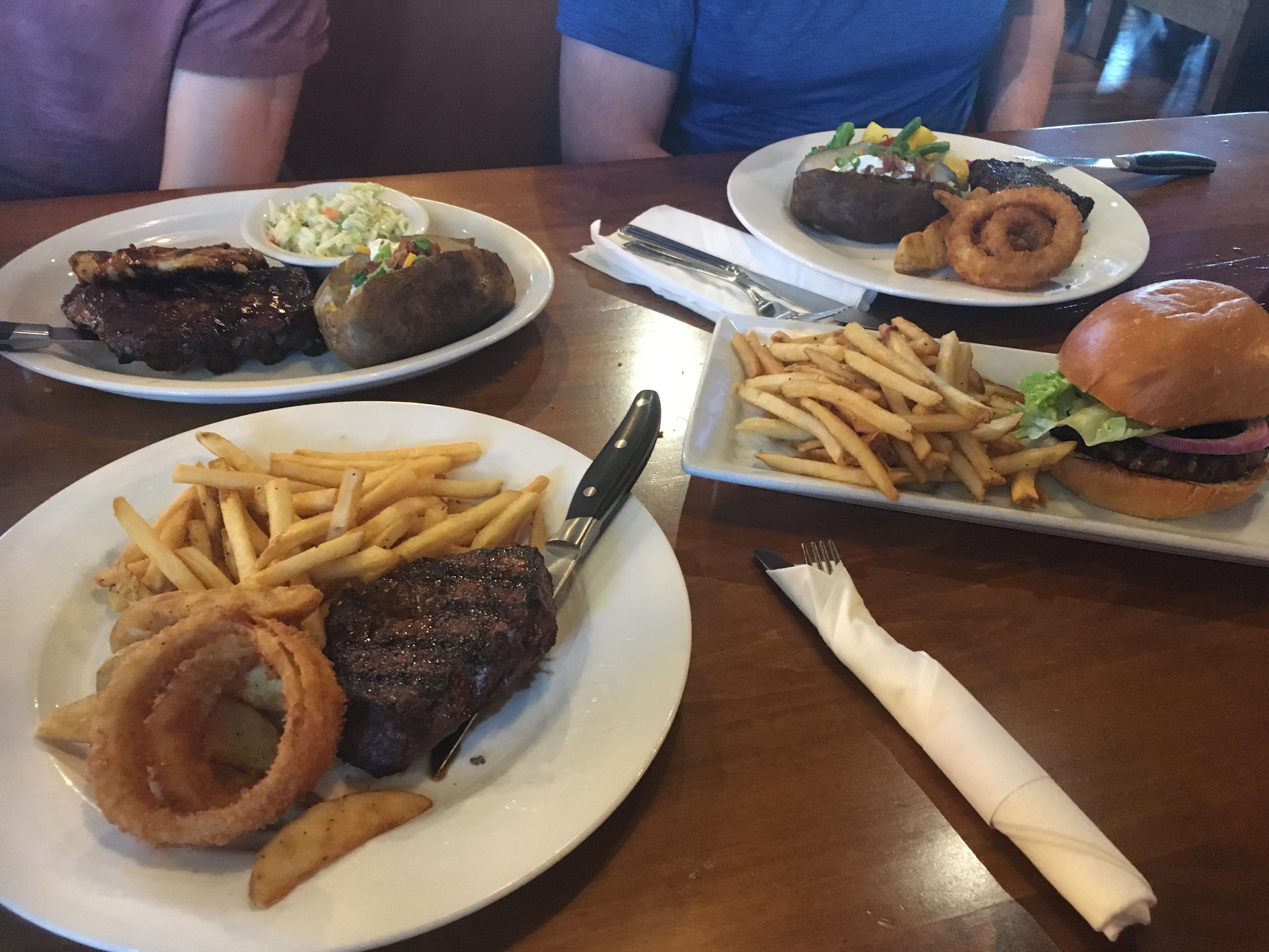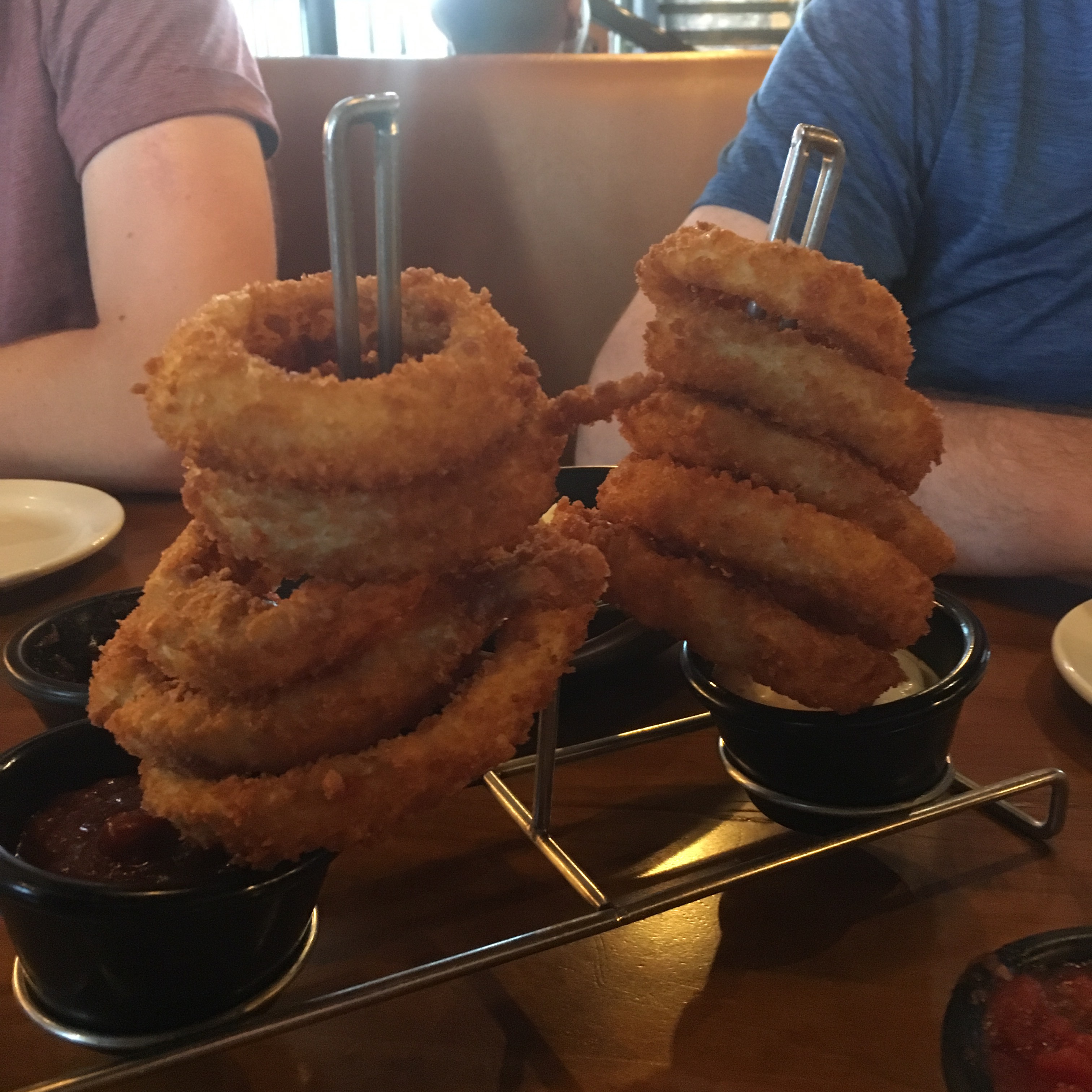 Inmiddels was het een uur of drie en zijn we weer in de auto gestapt richting Toronto. Het was nog ongeveer anderhalf uur rijden. Uiteindelijk kwamen we rond kwart over vier aan bij the Lone Star in Toronto, hier hadden we op de verjaardag van mijn moeder ook gegeten en dit was goed bevallen. Daarom hier ook onze laatste maaltijd in Canada gedaan. Eenmaal binnen hadden we weer dezelfde serveerster als de vorige keer en heel toevallig ook weer dezelfde plek. We hadden nogal wat tijd te doden tot we op het vliegveld moesten zijn en daarom hadden we aangegeven dat we vandaag de tijd hadden en daarom niet onze gerechten heel snel achter elkaar hoefden. Dit was geen probleem. We hadden als voorgerecht Onion rings die we gedeeld hebben. Hoofdgerecht was ook weer erg lekker. Met in ons achterhoofd het idee dat het vliegtuigeten nou niet bepaald smakelijk is hadden we ook nog wel ruimte voor een toetje!